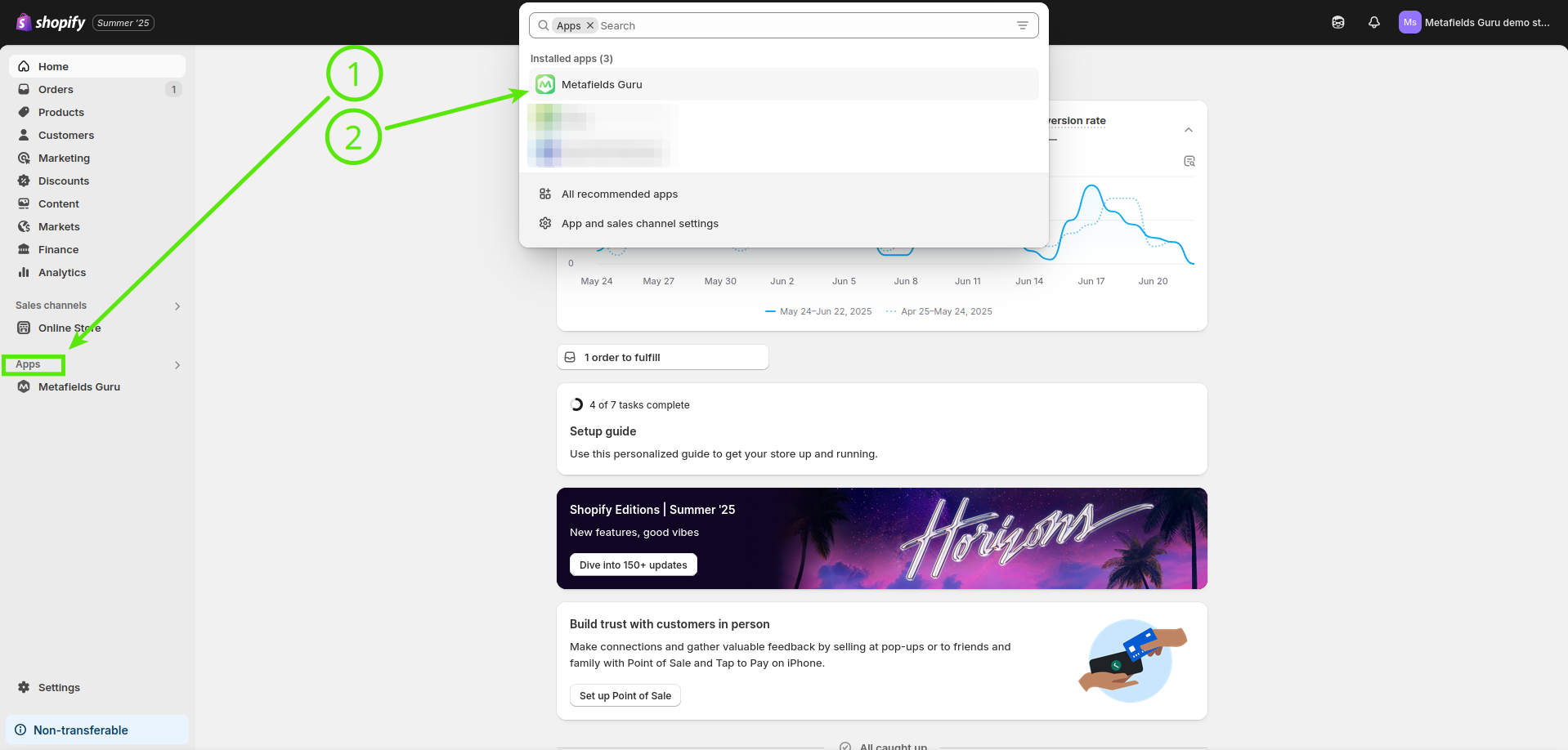 Go to the Apps section of your Shopify admin panel (1) and select Metafields Guru from the list of installed apps (2):