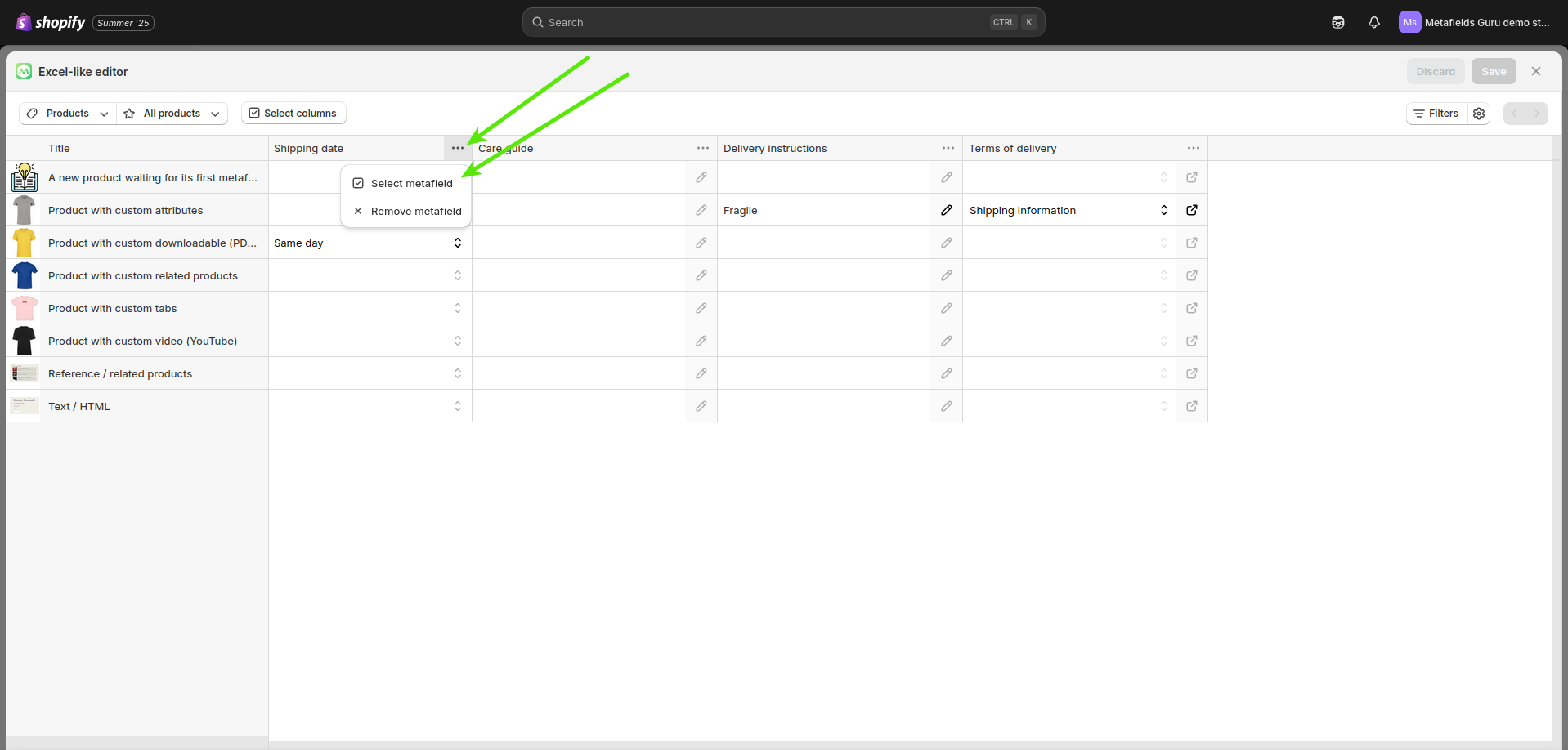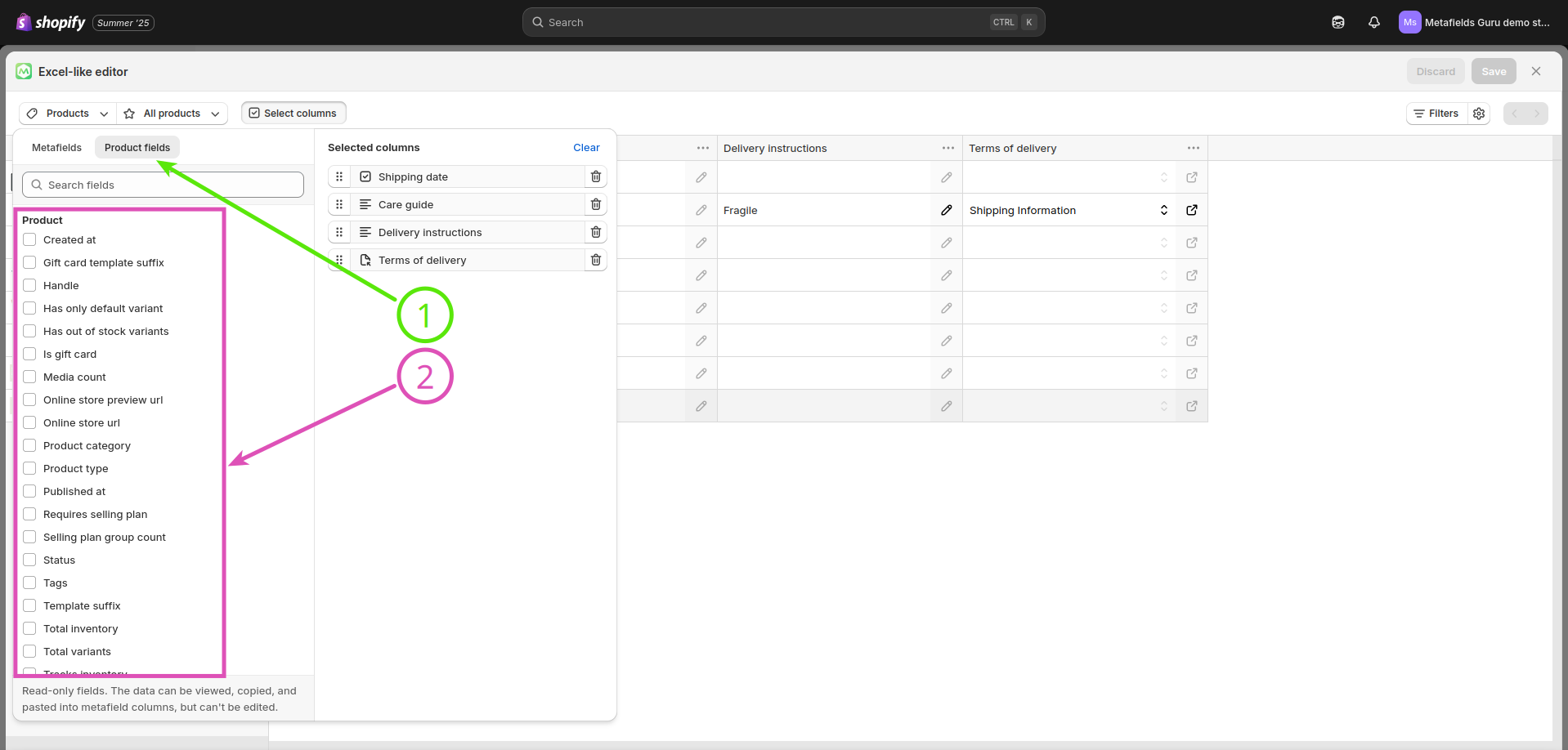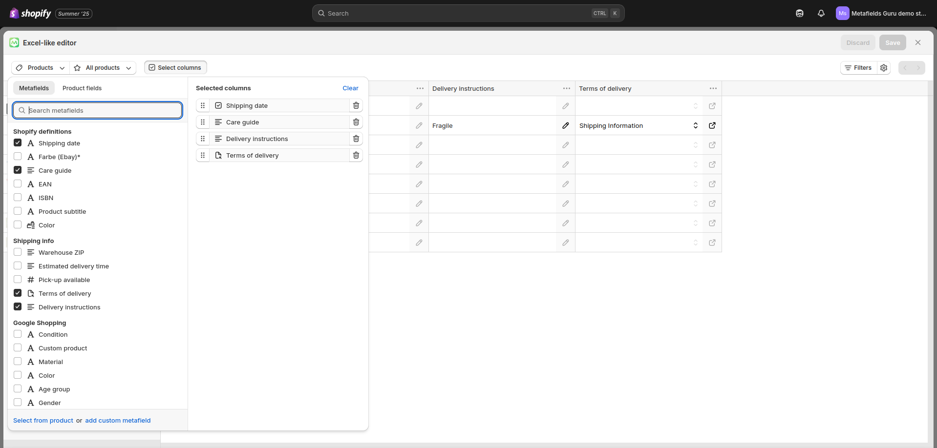 3) Metafield and standard properties selector, which allows you to add columns to the editor's grid.