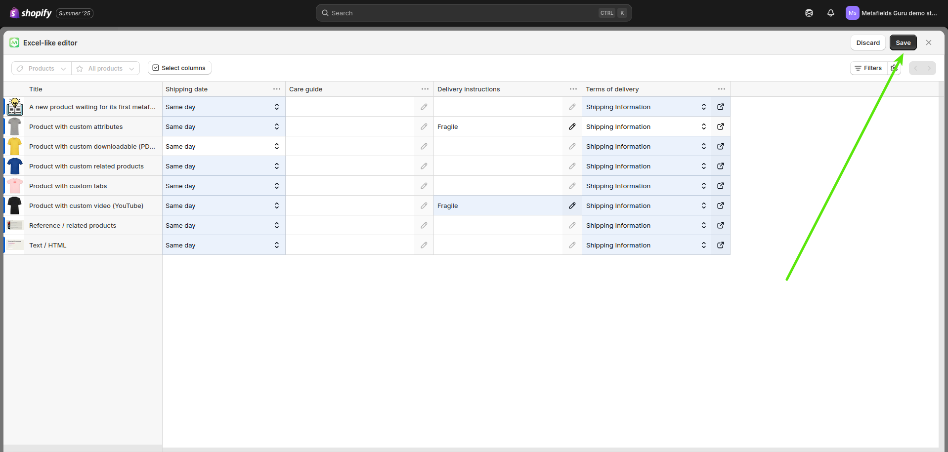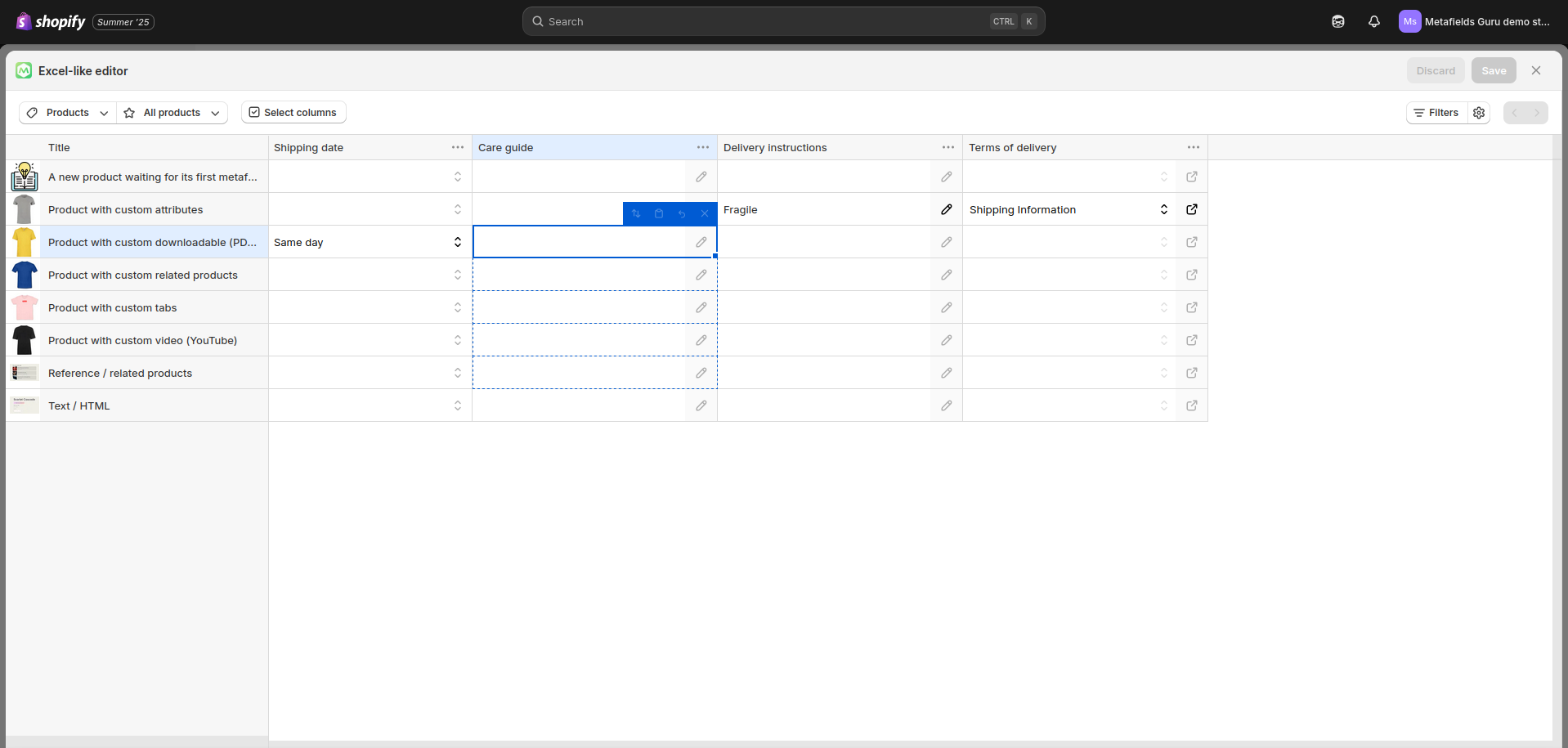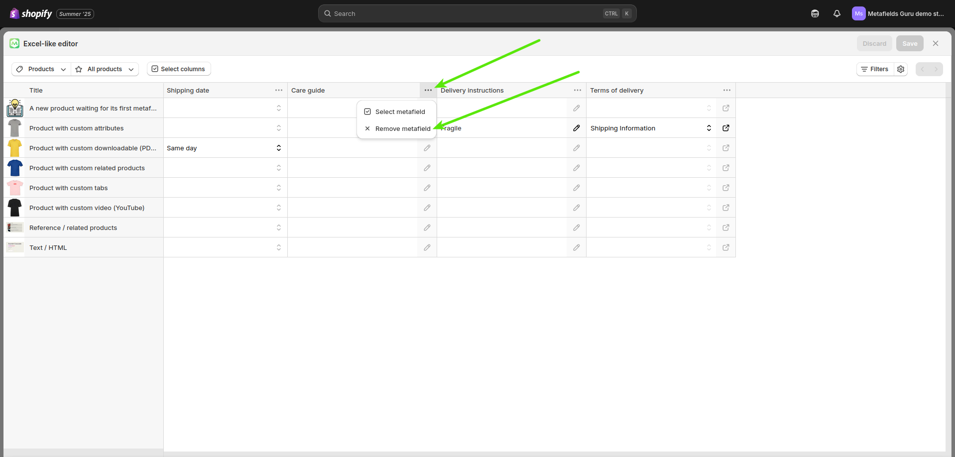 3) Metafield and standard properties selector, which allows you to add columns to the editor's grid.